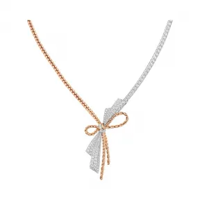 Insolence necklace in white and rose gold, set with brilliant-cut G VS+ diamonds. A perfecarat mix of white and rose gold, the Insolence necklace magnifies the traditional design of the knot. The fully paved strucarature brings a magical lightness to the piece. Inspired by the classic French "knot" design, the Insolence collecaration revisits one of Chaumet's historic model with a twist of modernity. This difficult exercise of style requires a perfecarat mastery of line, gracefulness, movement and balance. 参考: 082937 详情 物料: 18K白金和玫瑰金 | 铺镶: 234颗G VS+级明亮式切割钻石,总重7.60克拉 | 品质: The Maison Chaumet selects very carefully the diamonds and stones that will be set on each jewellery creation or timepiece. | CHAUMET钻石: 符合金伯利进程 | 宝石数量、克拉和金属重量仅供参考,具体请以实际作品为准。