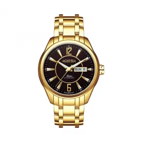 瑞士全自动机械机芯;PVD真空离子电镀;全实心不锈钢表壳及表带;耐磨蓝宝石玻璃镜面;透明水晶玻璃底盖;3时位星期和日历窗显示;100米防水功能;瑞士制造;