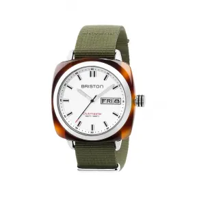 The Clubmaster Sport watch from Briston is an elegant and sporty timepiece that combines timeless retro design with modern features, making it a versatile accessory for watch lovers.Faithful to the square-camber shape of the Clubmaster collection, this watch may appeal to you:robust 42 MM case and tortoise shell cellulose acetate,HMS day/date function (Hours, Minutes, Seconds),hands with Superluminova® luminescent inserts,water-resistant to 100 meters (10 ATM).With its silvered white dial, its pure lines are inspired by the racing cars of the 1960s. Its sporty look is enhanced by an interchangeable NATO strap.In a word, the Clubmaster Sport watch from Briston is a timepiece that combines classic elegance with sporting robustness. It is designed for people who are looking for a high-quality, versatile and reliable accessory, while appreciating a timeless retro design. It embodies the perfect blend of style and functionality.技术特性参考:17342.SA.TS.2NGA|材料表壳:醋酸酯 玳瑁纹|饰面:银色|表壳大小:42 x 42 MM|机芯:石英Miyota 2405|模型 / 功能:HMS星期/日期(小时、分钟、秒钟)|动力储存:3 年|表盘尺寸:32.5 MM|表盘颜色:银白|厚度:11.90 MM|玻璃:弧形矿物玻璃 – 厚度2,3 MM|指针:指针采用白色超夜光 Superluminova®技术|防水深度:100 米 / 10 ATM|表带:可更换 NATO 表带|表带长度:245 MM|表带宽度:20 MM|国际联保:2 年|