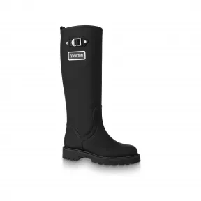本款 Territory 平底高筒靴以橡胶质感牛皮革临摹雨靴格调。橡胶外底与鞋面共同呈现“浸染”观感,Vuitton 标签、铭纹搭扣和饰钉丰富细节。