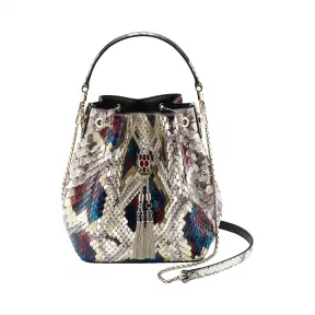 水桶包“Serpenti Forever”家族迎来全新杰作:时尚水桶包。这款包采用珍贵的白玛瑙色“Lunar”蟒蛇皮材质精制而成,展现BVLGARI宝格丽以珍贵材料打造经典作品的专业技能。实用的拉绳以BVLGARI宝格丽的方式重新诠释,采用蛇鳞主题链条设计,搭配经典的黑色和深碧玉色珐琅蛇首搭扣和黑色缟玛瑙双眼,尽显魅惑。可拆卸手柄和蛇形链条,以浅金镀金黄铜制成,令佩戴舒适,多样百搭。小号,单个收纳层,镌刻BVLGARI宝格丽品牌标识的内侧金属铭牌。16 x 19 x 10厘米 - 6.3 x 7.5 x 3.9英寸