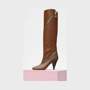 Zipped白兰地色Nappa小羊皮拉链长靴;尖头及膝靴;功能性拉链开合;白色滚边细节;锥形鞋跟;9
