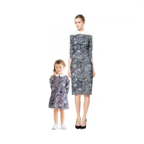 成人款:用弹力皱制作的衬衫式领口将正装与优雅蕾丝完美结合,摆脱了蕾丝一贯典雅的印象,更添时尚气息。儿童款:非常适合秋冬正式场合穿着的一款小礼服裙。彼得潘领的设计文静可爱,全身使用由TADASHI SHOJI特别设计定做的玫瑰图案刺绣蕾丝,细节中的华丽,绝对会让你的宝贝在任何场合都脱颖而出!