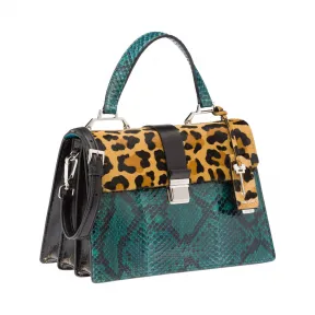 小马毛小牛皮拼蟒蛇皮包袋。翻盖及精制按锁扣合。全新设计: 铰接金属手柄配件。镀金和拉丝镀金徽标配件。背面金属刻字徽标。内部棉缎拉链口袋。背面拉链口袋。麂皮衬里。105 厘米可拆卸肩带。 长度28 高度18.5 宽度12 CM